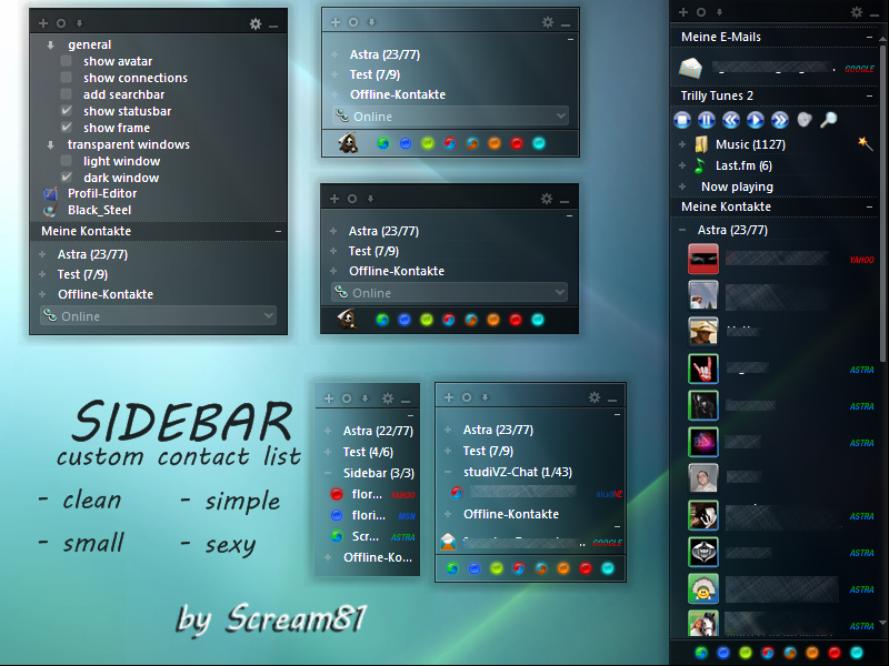 Ach, und außerdem wäre ich dir himmelhochtausendmal dankbar wenn du auch die restlichen Skins in Angriff nehmen könntest, sprich Nachrichtenfesnter, verlauf und die popups und die näheren infos bei den Kontakten.