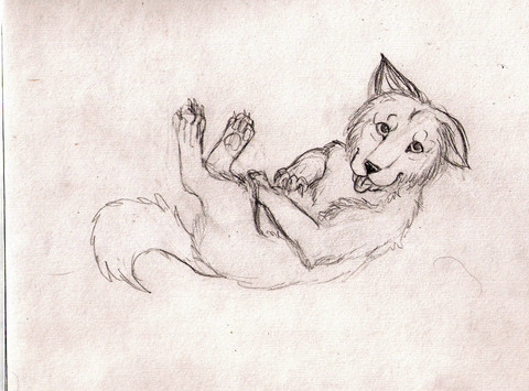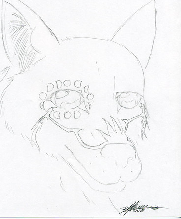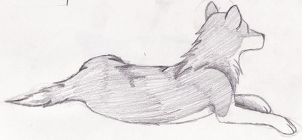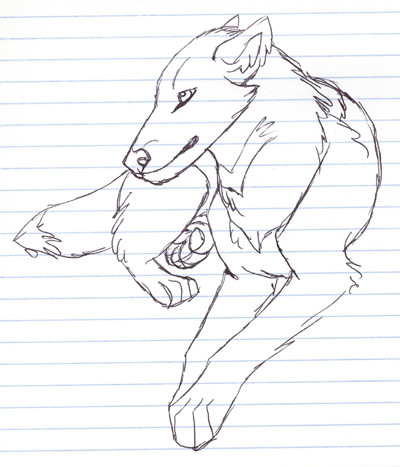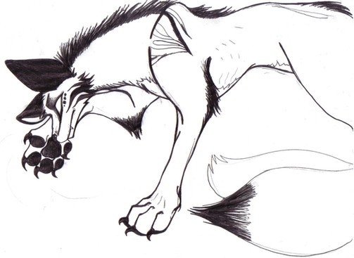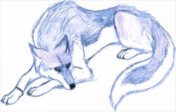 A sketch I did a while back during my Geography exam.This is Hade. He's a pure white wolf with gold eyes. The spots and tail tip are black, along with his claws.