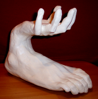 My latest stone sculpture. It depicts a rock climber's hand holding onto a rock. The piece is made from a single piece of Utah Alabaster; the hand is a different color because it has been polished. It is about 1/3 bigger than life sized.Related content