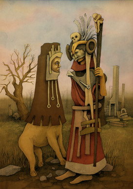 I love this piece. The kind of "alter" design is quite striking. The two little people with bird beaks β so, so cool. I like the stylized faces of all three figures. The colors are so simple, but they have such a strong impact. Really interesting!