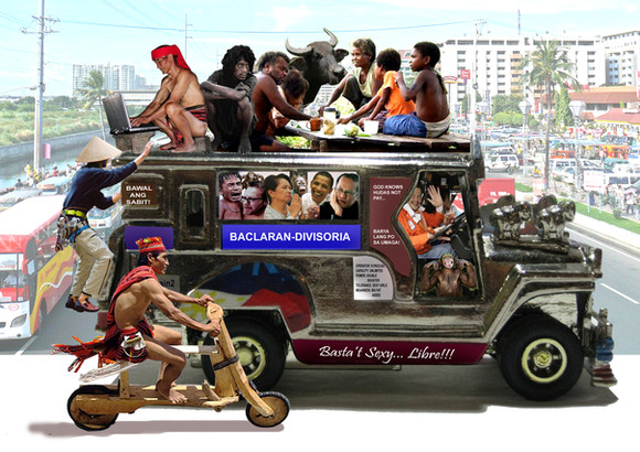 This vehicle is called a jeepney. It's the most common public transport for the masses in the Philippines. This was taken in the Sierra Madre mountain range and transport going to the city from there is rare so whenever there's a jeep they have no choice but to stay on the roof and stand on the rear bumper all the way to wherever they're going.Related content