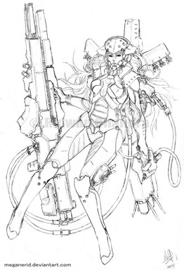 Pretty damn good. I like your control over what has detail and what doesn't. The pic may be congested for some... but it doesn't go over that line too much. I love her "shoes" and the insanity with her weaponry. Her face, like all the faces you draw, has an interesting, and kind of unexplainable, emotion to them. Pretty good pic