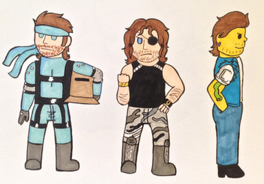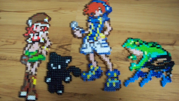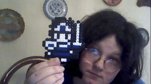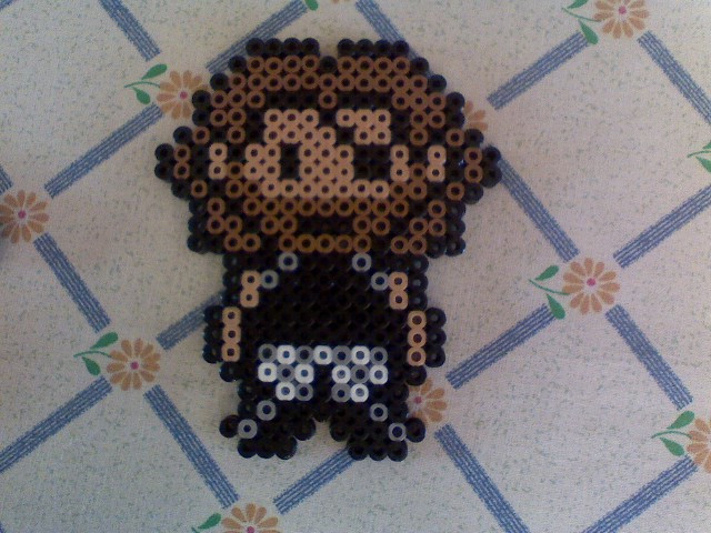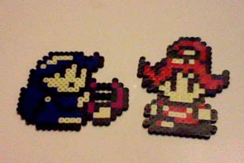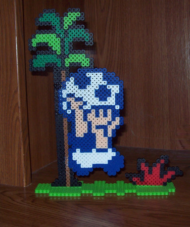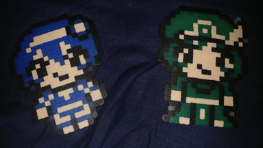some derpy perler bead thingies I made w/my best frienditβs me, Solid Snake (in Earthbound style), a derpy box, a buzzy beetle and a !