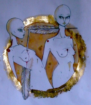 Watercolor, November 2012. The original is postcard sized.An exercise in complementary colours a watercolor course; I'm trying to make the lessons at least a little interesting by painting subjects that matter. The horse is not supposed to be F but a regular bay horse. This picture may look nice when viewed from a distance.