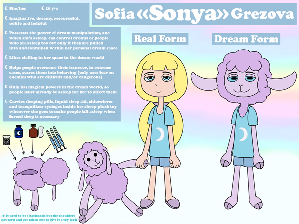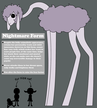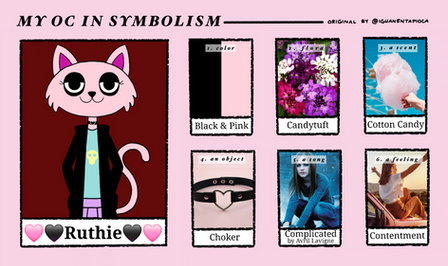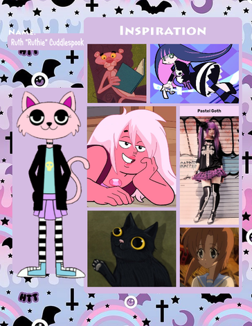 History: Ruthie was created by two girls who are sisters - Dulcie Wonder, an 8 year-old who is really into cute things and pastel colors, and Melanie Wonder, a 13 year-old goth. Despite their difference in age and interests, the girls got along and came up with Ruthie together. She is an embodiment of the harmony of their opposite vibes, their strong sibling bond and their kind souls. Ruthie and The Wonder family lived happily, but at one point some guy at Melanie's school started to hit on and stalk the girl. The family tried to get a restraining order for him but the guy's parents were rich enough to get their son out of troubles. Ruthie couldn't take her family being hurt like that and the next time she saw the guy near Melanie again she started a fight with him, leaving his body cut and bruised. Melanie and Dulcie, who was with her sister at the moment, were both very shocked, so Ruthie, thinking they hate and afraid of her now, ran away. In a few days, she got the courage to come back home only to find that the Wonders were gone. There she found a note for her from which she learned that the family moved to another state to get away from Melanie's stalker and his family, that the girls still love her a lot and are thankful to her for protecting them and that they're are very sorry they weren't able to find her before the time they had to leave. Ruthie felt guilty that she got an idea they would ever think badly of her and sad because she didn't have a chance to even say goodbye to them, but relieved to know they are safe now. She was homeless for a while and wandered around within the state until one day she came to Foster's Home For Imaginary Friends, where she found a new home and made many friends.