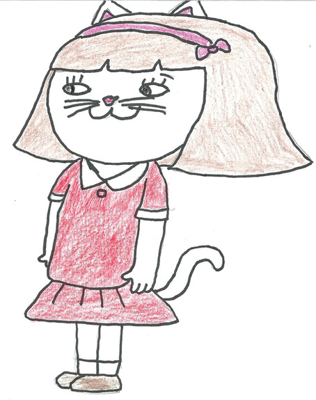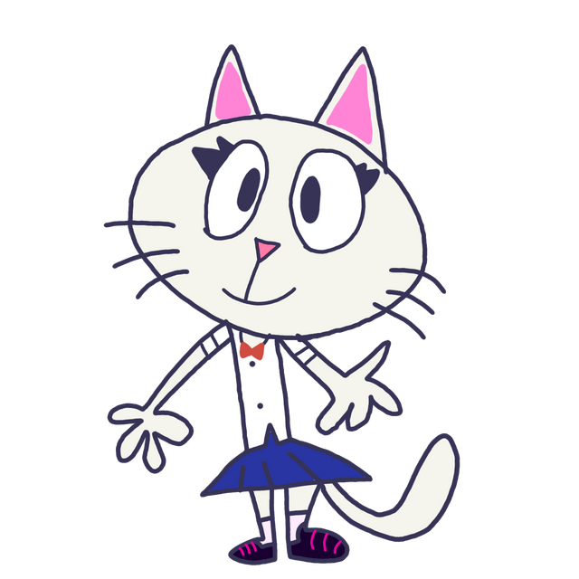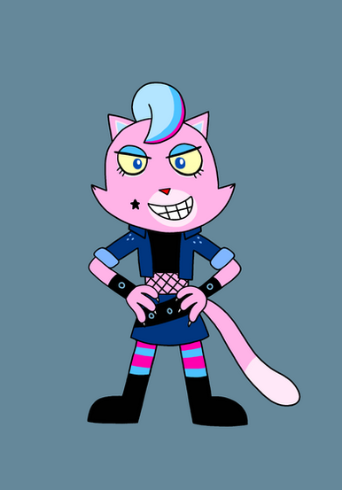 Appearance: She's a skinny anthropomorphic cat with pastel pink fur. She wears black eye shadow, black chocker with a silver heart, pastel turquoise T-shirt with a pastel yellow skull with heart-shaped orbits, black leather jacket, lavender skirt, black and white striped stockings and pastel blue and white chucks. She almost always has a relaxed expression with her eyes half-closed.