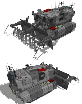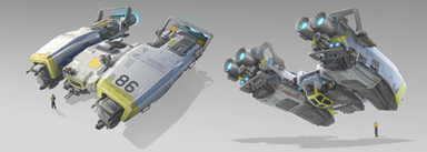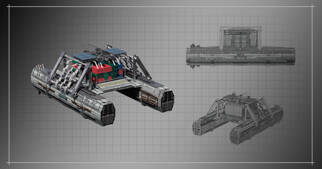 The Massive Establishment Vehicle, or MEV for short, is the largest vehicle envisioned by Civitech Industries. It's main goal is to oversee large containment operations of storage facilities such as containers as seen here. Not only does it transport containers and other storage devices, it can act as a mobile HQ for a small storage company. It does this by having all the essential tools all around the vehicle itself, from main computer hubs around the canopy region to small offices in the outer shell of the vehicle. Naturally many companies have their own logos and slogans splattered all over the exterior of the vehicle; here we have the default scheme of the vehicle as if it just hovered out of the factory.
