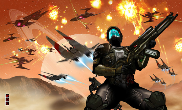 Humanity has expanded to the stars, but continues to fight its wars the way they always did. A land war between two rival nations on a distant planet suddenly gets complicated when an inscrutable alien race with highly advanced aircraft and armour show up and start attacking both sides! The player's race must then fight both his nation's enemies and this unknown menace, but it slowly becomes clear that they're not too different. It turns out the aliens actually once settled this world, but left it as a memorial after a disastrous event wiped out their colony there. They see the humans (who have now joined together to fight them after the enemy country took enough of a pounding from your ace flying) presence and bloodshed on the planet as sacrilegious! Naturally, through that special connection only two aces locked in a dogfight can share, you and your squadron slowly start to empathise with the aliens and eventually, bring it to the negotiating table. The final battle against the superweapon takes place because of an extremist faction of the aliens who just won't quit and have warped their weapon into low orbit of the Ace Combat homeworld. After you and your squadron asplode it by flying down the barrel, all factions involved go on, hand in hand, to a bright new future under shared skies.