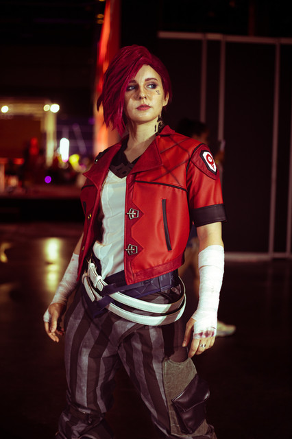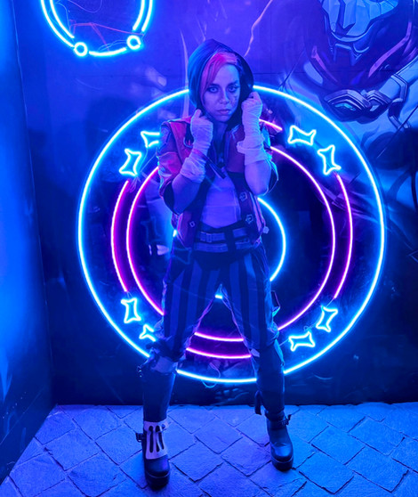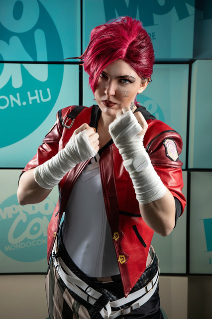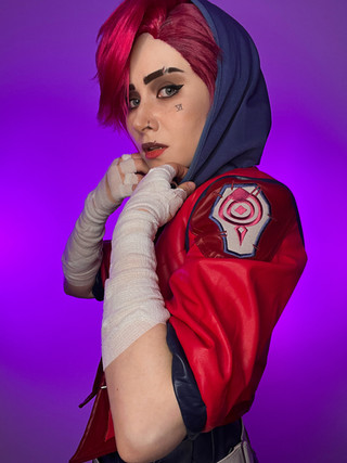 Violet , mejor conocida como Vi , de niña fue una criminal de las calles mezquinas de Zaun, era una chica exaltada, impulsiva y terrible con un respeto muy vago por las figuras de autoridad. Al crecer casi sola con su hermana, sus amigos Milo, Claggor y Vander como figura paterna, Vi desarrolló instintos de supervivencia, liderazgo y responsabilidad, así como un sentido del humor perversamente abrasivo. Años después estaría encerrada en la prisión Stillwater, saliendo por consentimiento de Caitlyn a buscar información de Silco, motivada por volver a ver a su hermana.Cosplayer: www.instagram.com/greciacosplay