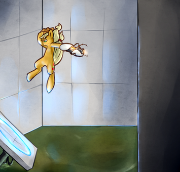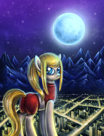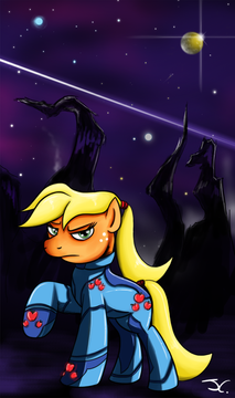 Combining Zero Suit Samus and Ponies is just WOW. There are no words to describe this, but I will try anyways. I love how the blue and yellow contrasts with the darks of the back ground. The hair is very nice too and the eye look like you could get lost in them. Form and expression are true to the character.