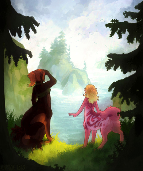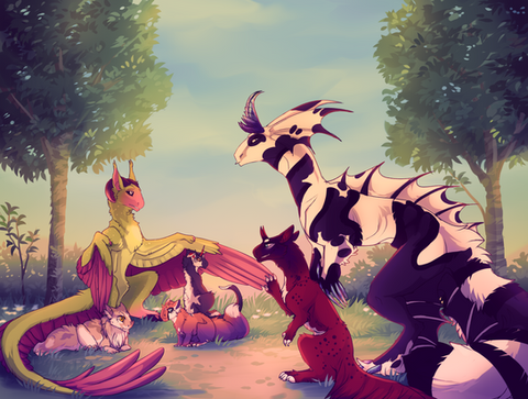 TRADE WITH HeidiHakalaArt , TYSM FOR THINE PATIENCE FRIEND DEAREST!! I had this sitting in my stash for so long and realized I didn't even post it. Oh my god. This one's a training entry for the amber siblings, Kaali and Sinappi. Sauma teaches them about the wonders of plant life, what works for good food and what works as medicine. The aerials on the tree watch on and Oja looks like he walked in by sheer accident. [insert that one specific inside joke here *COUGH COUGH*]