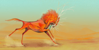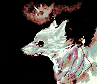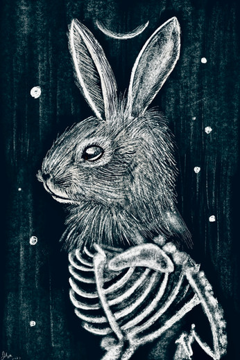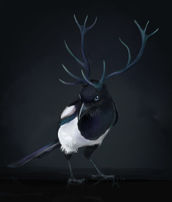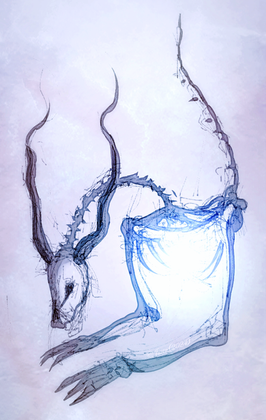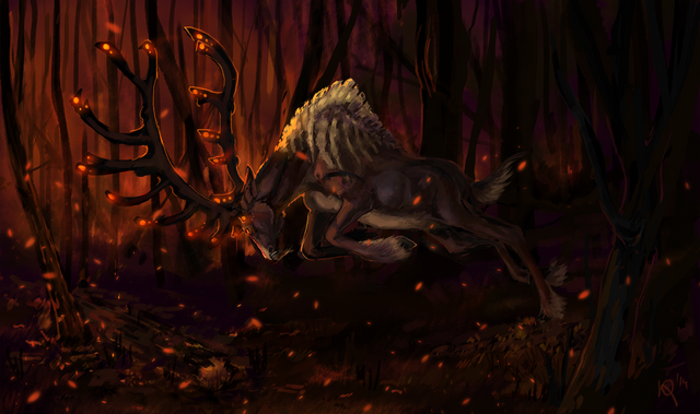 This is such a gorgeous and emotional picture. I really love it. The glowing white deer feels so cold like frosted over cobwebs. I love the pose he is in and the way you drew his face with its pulled skin and the bones inside his body slowly coming out. I like the touches of red for his blood and guts because they are not overdone but realistic and symbolic. His story is very beautiful as well which I love. Gorgeous job.