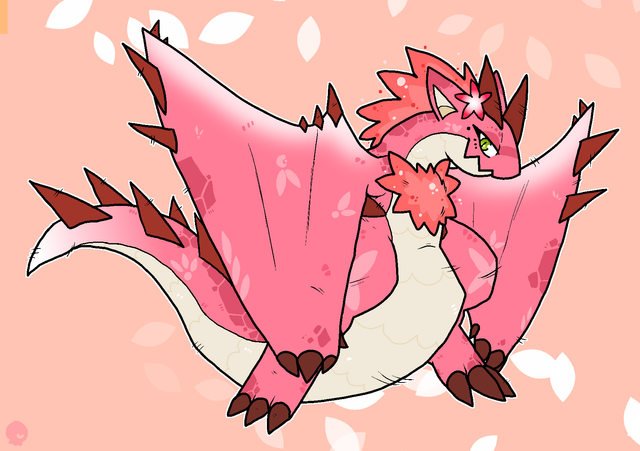 Here’s the other Monster Hunter fanart I had planned for today!Whenever I see Pink Rathian, I think of cherry blossoms due to my first encounter with it back in the original Monster Hunter Stories. After you made it through the cave with the Khezu boss, you entered a path lined with cherry blossoms. There’s a Pink Rathian that’s always sleeping under one of the trees, and it will absolutely destroy you if you try to take it on before you’re really ready.