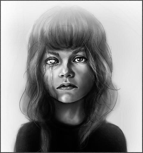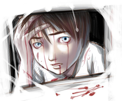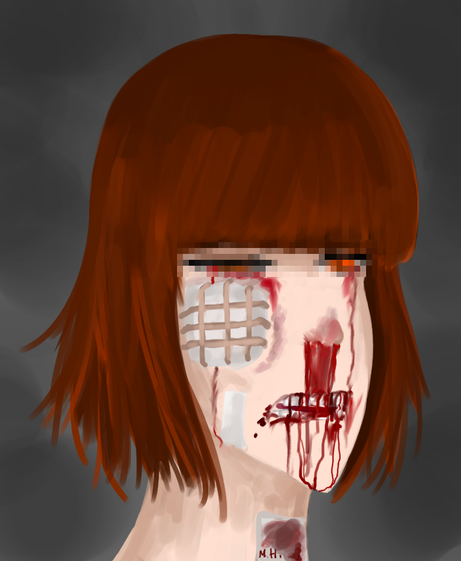 a sort-of unfinished ballpoint pen drawing, as you can see from the hair. I had to take a picture of it, but I like this look for it (minus the hair being more blurry, it's much sharper than how it looks here). drawn on white typing paper. blood edited in Painter and shininess added. and that's about it.Related content