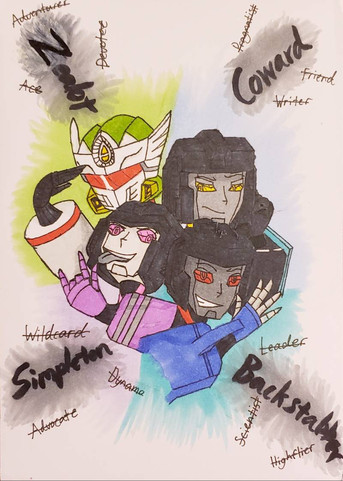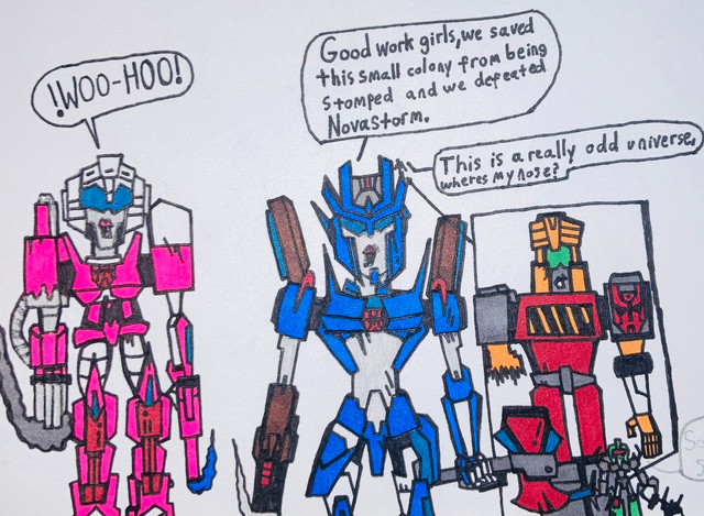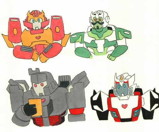 Autobots are avid fans of soap operas and no one can convince me otherwise. That said, surely they watch other things too, so here we have Sideswipe, Bluestreak, Hot Rod, Sideburn, and Silverstreak (an OC I created before I learned that was an alternate name for Bluestreak) watching Sailor Moon Crystal. Specifically season 3, episode 11.I can't draw backgrounds to save my life. One day. I do believe I've gotten better with speech bubbles since I drew this, however.