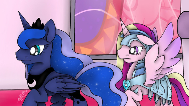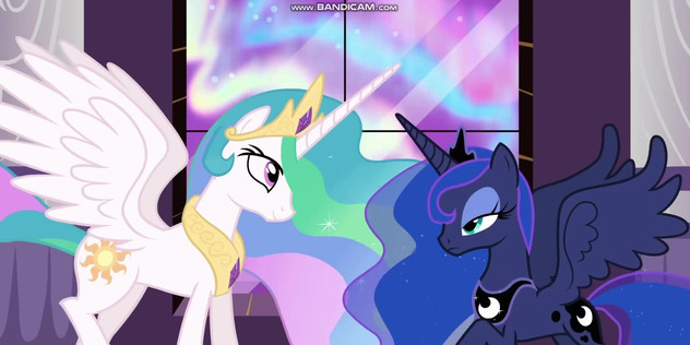 Princess Celestia and Luna are watching the window in concern.Princess Luna: I can feel it sister. He’s coming.