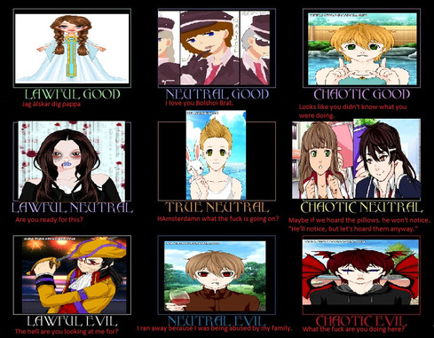 Decided to try this out with the original characters in THS and TCG (My opinion on who goes in these spots). Spoilers down below for those who haven't caught up with the THS/TCG Universe:Lawful Good = Lumina