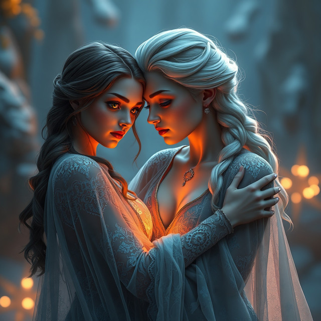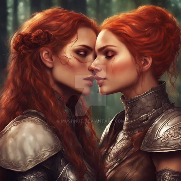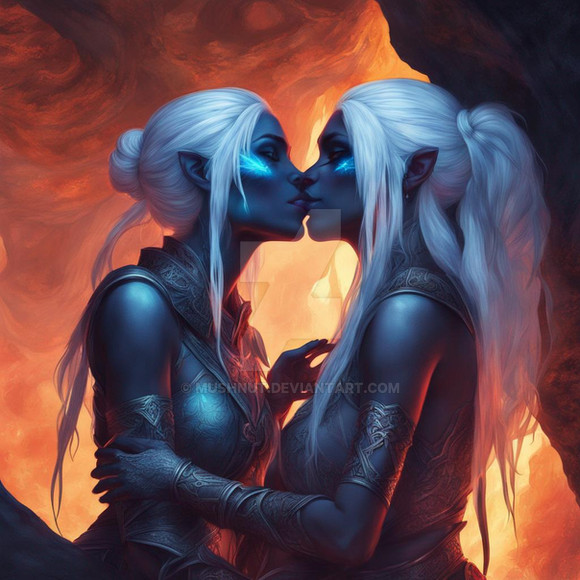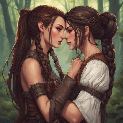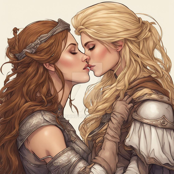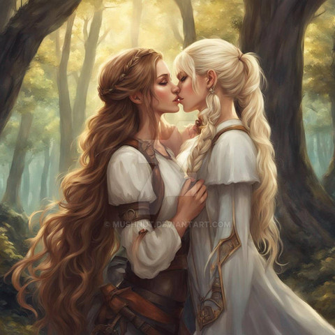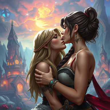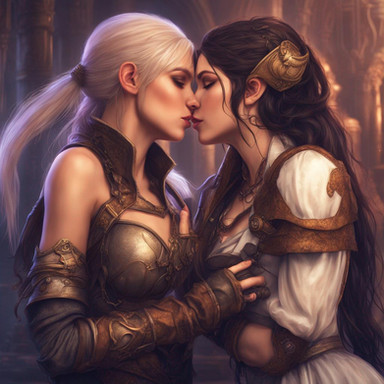 #ai #magic #fantasyart #fantasycharacter #characterdesign #blonde #brunette #couple #date #dnd #dungeonsanddragons #duo #fantasy #girls #kiss #kissing #lesbian #love #rpg #woman #women #dreamup