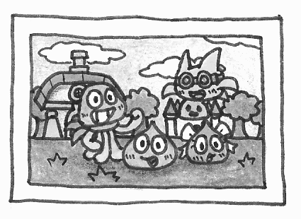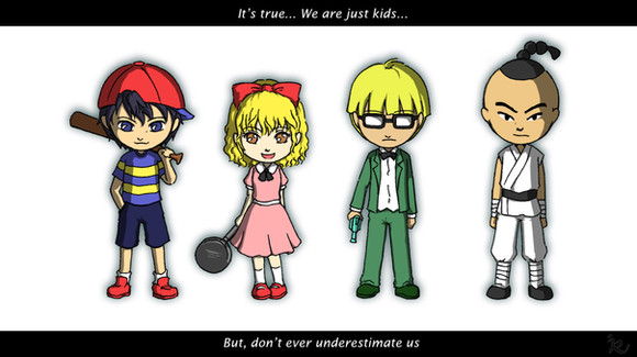 I can imagine this being something out of Ness or Paula's sketchbook. I can imagine them showing it to their parents and saying "Here's a drawing of me and my friends. The red swirly thing in the back isn't a friend."
