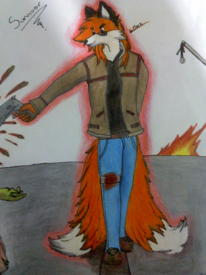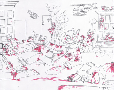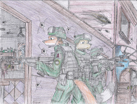 I really like this drawing - the background is great, makes me think of Call of Duty, so I guess that ties in to the "militia under fire" theme . I also think that the small amount of bright colour works well.
