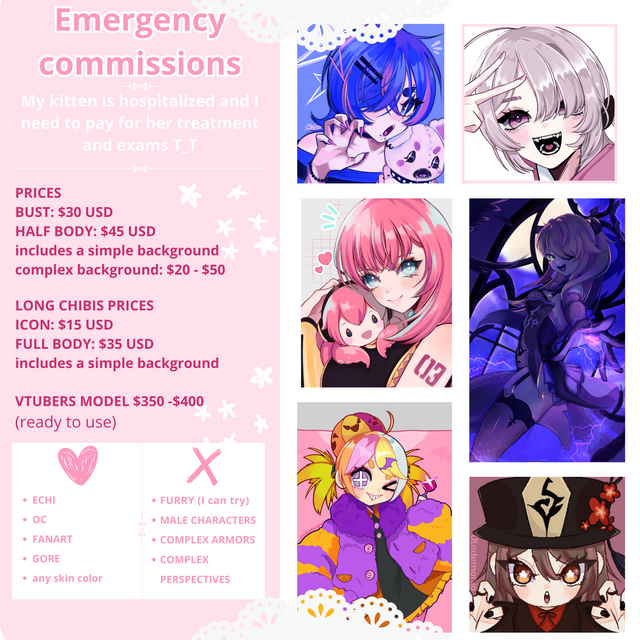 HI!! sorry for not updating here very often!!I need to open commissions as soon as possible so I'll leave this sheet here. I'm in a rush so... for now I can only offer chibis.