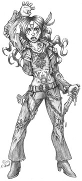 She looks awesome! But of course she does, and as for the mocking...yeah, characters do that. Love the sepia tone on this too, and her attitude definitely shows.
