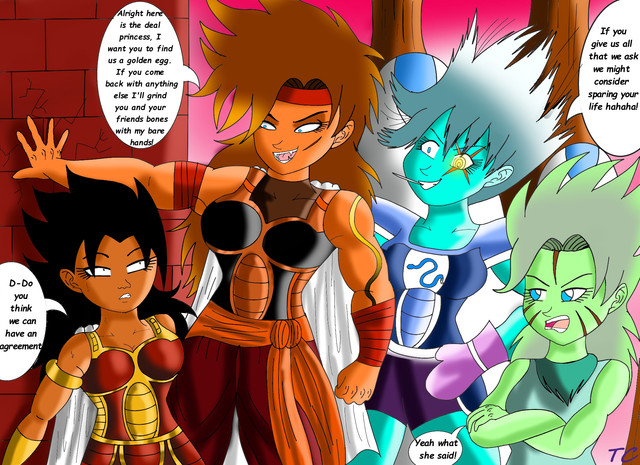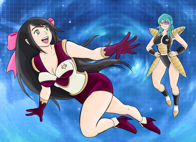 Exélixi-Bulla was now wearing a new outfit herself. I was reminiscent of Exèlixi's armor but different. She was wearing modified black headgear which covered her chin, jaw, and went up around her head, cover her forehead area. In the front the headgear had the shape of the 'crown' that was on the armor. The upper armor covered her breast and there was a Blue oval with the symbol of the Exèlixi on it. She had blue shoulder pads that were connected to the breast armor. She wore red arm guards without gloves. She wore a red skirt similar to 18's and black pantyhose. She wore red sayian boots. Exèlixi-Bulla smiled looking at Mia-Pan as she walked over and looked but and down.
