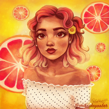 And talking about who tf this wooman is, she used to be a beloved oc of mine.. Idk why but when I was an early teen I loved to make a lot of female ocs based on fruits, and this one was a grapefruit (Pomelo is just the fruit's name in Spanish) My favorite though was one that was a strawberry, Fresita and the cool thing about both of them was that they were sisters or cousins, I don't remember well but I'm sure they were family.. I should redraw Fresita too, but I gotta search for old drawings of her and I'm lazy to do that rn..