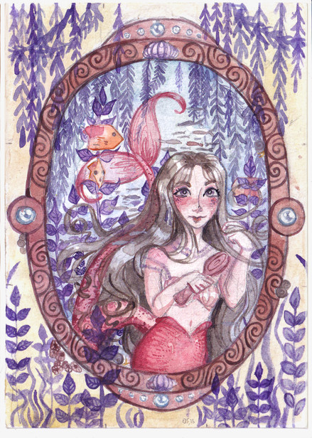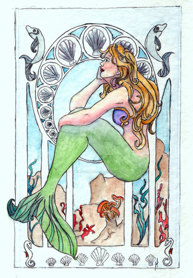 ^^ i really wasn't fond of the lineart for this one when i started, but i have to say that i am pleased with the finished piece. I love the colors in it ^^ especially in her fin. This siren is the fishy version of my character Aerendeln, who does not normally have pink/red hair...or go topless on rocks in the ocean.lines in pencil, colors in watecolor, highlights in white acrylic.