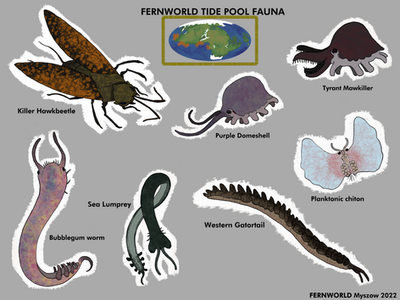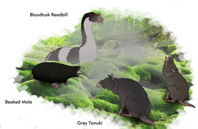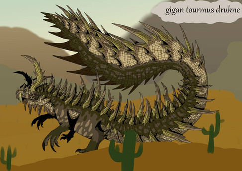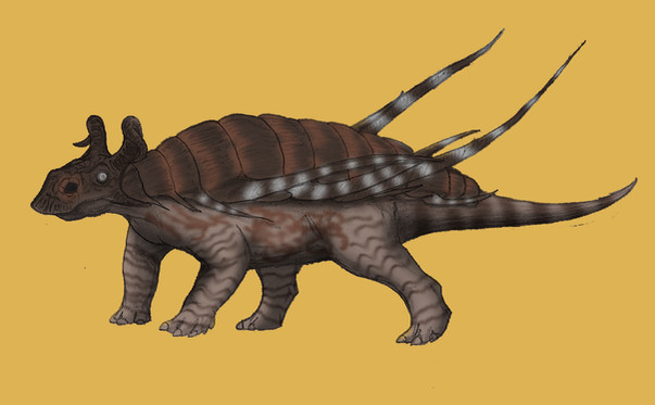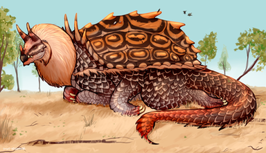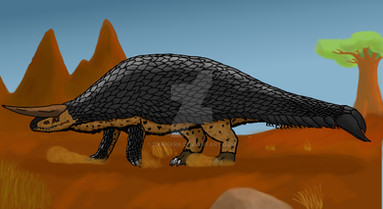 On dry plains covering most of the southern hemisphere, a scary-looking animal wanders around. With scutes hard as metal shells, giant nosehorn and sickle-like claws, Desert Razorback (Spinotherium desertus) may look dangerous, but it's a peaceful animal for the most of the time. Measuring 4 meters while sitting, Razorback spends most of it's life hunting termites and ants. Using large claws and nosehorn, Razorback destroys insect nests and eats their inhabitiants with his long, sticky tongue. Sometimes Razorback eats plants and fruits, but desertsΒ the deserts are rather not abundant in them. Razorback is member of postmammal clade, just like Pikedogs. Postmammals, sometimes called Neosynapsids are dominant land animals in this world.Related content