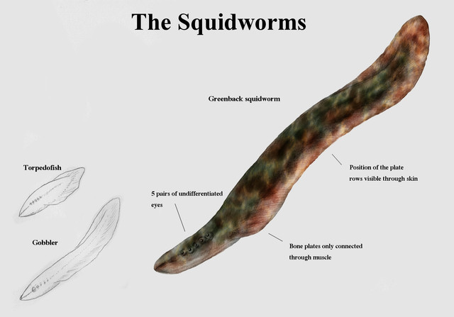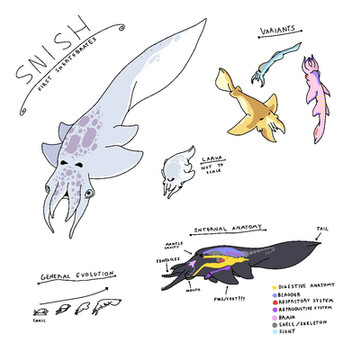 THATS IT NO MORE AMMONITE-LOOKING ASSLooking back at my old designs for scaphopods and cringing hard. Thankfully i decided to rework them a bit (and finally stopped to learn their anatomy), so final design of scaphopods: jet-propelled, fish-like almost-cephalopods. Their old designs will be used sometime later for other sea invertebrates. Chitons stay as they were btw.