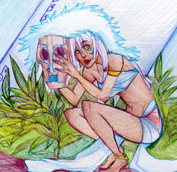 I've been working on this for a while. It was a bit of an experiment, since I was working with three different light sources, being two different colors. The scanner kinda messed up the way the shading was, I tried to edit it... but its ok, not too different from the original. Sorry for her ugly hand and long armI did use references for the vegitation of Atlantis; I looked at some screencaps from the movie to look at the backgrounds(who ever did the background art of that movie is AWESOME!), but I noticed that Atlantis has no flowers..... wel, except there are some in the pond before the king... but the rest of the place has no flowers.