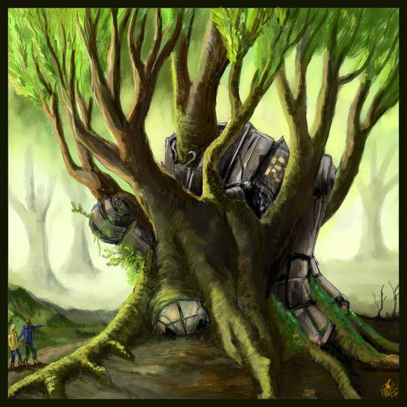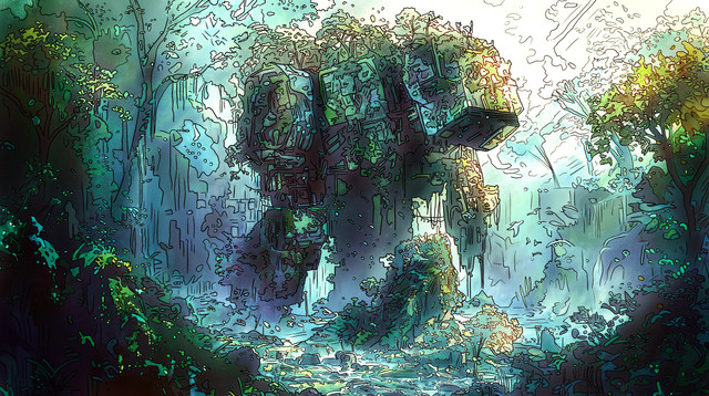 The sharp geometric features of te robot contrast nicely with the organic plant life. It's like a city, slowly being dominated and yet coexisting with a powerful jungle atmosphere