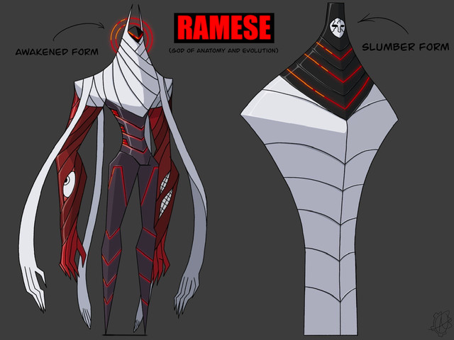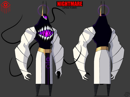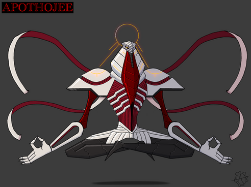 Weapons/powers: with the staff in hand they’re capable of controlling nearby beings, as well as capable of firing beams of actual light. Able to see things from far away with their exquisite eye sight, they can even make eyes appear somewhere far away if needed to. Even without its staff it can still use its tendrils to pierce or strangle opponents. When outside of its mechanical shell as it’s true form, not only is it huge but it can as well use telepathic abilities and other godlike powers to use as an advantage towards opponents.