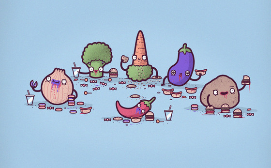 I love the little aliens(or whatever they may be) cooking stuff up on the green bean pole looking thing. Cool job making the junk food look like zombies. (^,^)