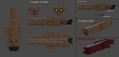 Los krogand diseñaron sus navescon una gran armadura, que permite resistir algunos ataques, y ademas, ellos diseñaron una torreta estandar tipo cañon de riel para todas sus naves. El cañon de riel es una version antigua de los actuales aceleradores de masa (arma tipo bobina). El cañon de riel es mas lento para acelerar proyectiles, pero los Krogans usan proyectiles explosivos para aumentar el daño (incluso, ellos pueden usar proyectiles tipo nuclear)