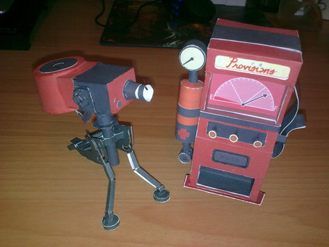 Engineer and a Level 3 Sentry from Team Fortress 2!Love playing Engineer so I went looking for a papercraft of'em. I wanted it simple enough to help ease myself back into Papercraft. Turned out harder then it should of been due to having almost no instructions. I included a backshot of the sentry to show how I did it, no clue if its the right way, others seemed to stumble with it as well.