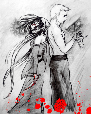 The colouring is well done, and I like the splashes of blood. my favourite thing about this picture is her body language, the way her arms are flung out as if she is playing. The contrast between their expressions and the background etc is really effective in portraying their characters' 'evilness'.