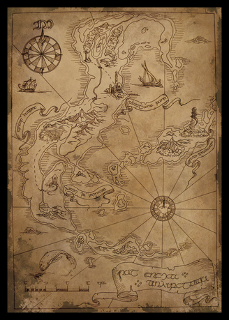 Sama mapa bardzo ładna, tylko ten kompas w prawym rogu... Klimatyczny element, ale jest jakiś nieco... Płaski? Wychodzi poza mapę, a mimo to wygląda jak namalowany. Deski pod spodem sprawiają równie płaskie i pozbawione głębi wrażenie, ale to chyba jedyne duże wady tej pracy od strony technicznej i dotyczą bardziej tła