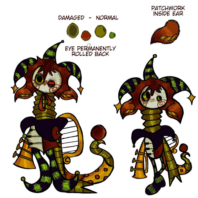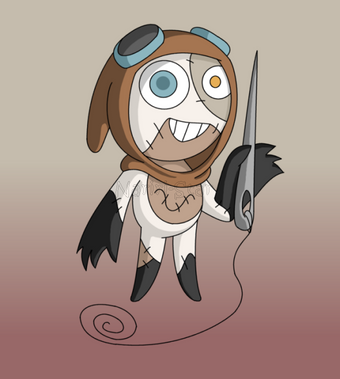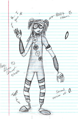 She is blind, she cannot see..not with her stitch-closed eyes anyways. Her owner could not finish adding her eyes so only made stitch ones. The "blush" is painted on, so it's always there. The hair is made of yarn. She can feels things through her feet and hands. She can hear things extremely well.... her senses are deeply in tune where her eyes fail. She makes a great listener and can tell when t hings are coming from a long ways away. She likes to hang around 6 who she draws with and listens very intently too. She listens to what everyone has to say, even if she doesn't agree with them. However, this doesn't mean she follows orders if her intelligence says differently. 8 is like a big buddy to her and he hates to put her into trouble...so he pretends and let's her go.