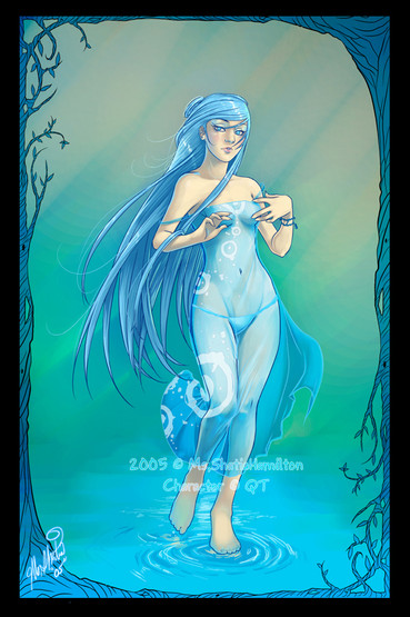 I love the shading on her skin -- it's almost plasticy looking, but it's a very cool effect. And the orangish tones against that aqua blue are lovely. :3