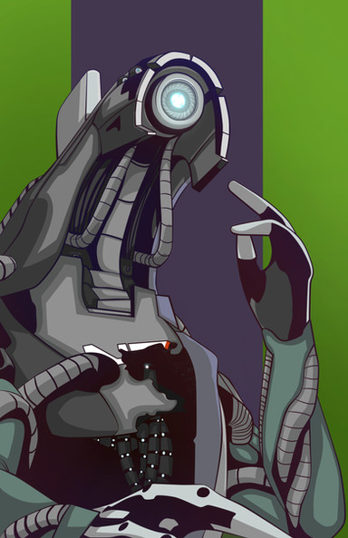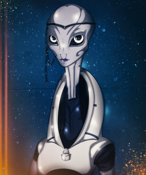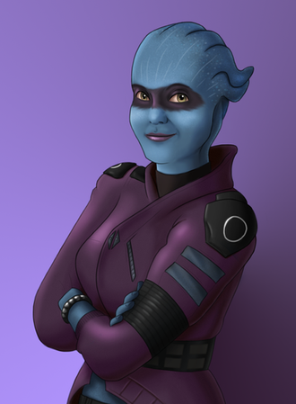 Dr. Liara T'Soni from Mass Effect, sexy asari scientist extraordinaire. My favourite romance. I've depicted her as the studious, brilliant, awkward girl you meet in the first Mass Effect. We all know how she becomes a total bad-ass after that one. Now I know that this is the future and nobody seems to wear glasses (eye surgery must be cheap), but glasses look cute. So there. Statues on Ilos in the background. Eep, scawy.If I can be arsed to do it, which I doubt, I'll paint the face and send the canvas to Bioware for their wall.