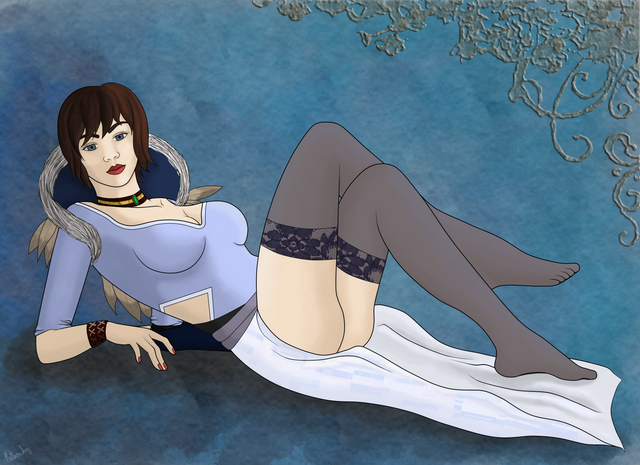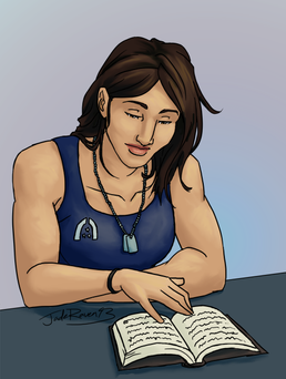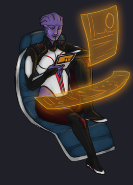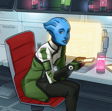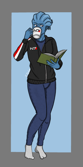 Those white dots on her... hair shouldn't go all the way down? And I want a copy of that book. Though I can only read Β "BLUE BLUE KASDBJAJ", but it seems like something she would read ("I'm blue, dabadee da daaa daba deee duum" -- sorry, the "Protheans: Fact or Fiction").Β