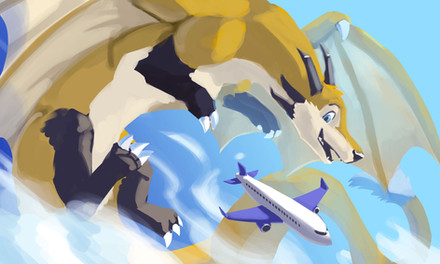 Jak dostałam info, że to ma byc smok lecący na tle nieba i że samolocik go okrąża, to pierwsz co oczywiscie przychodzi na mysl, to rzut boczny. Ale pomyslałam, że to bedzie nudne i poprosiłam Raste, zebysmy zrobili jakąś wspólną rozkminę i wyszło to