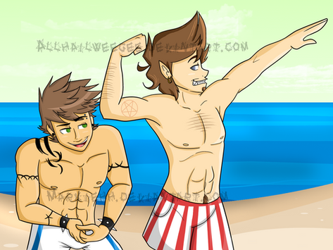 One day out in a holiday, Lithius Mordell was going about the beachside town of Monte Carletta, a well known beach that has an annual beach body contest to celebrate the first day of the summer festival. So Lithius decided to have a go at it for once, he went and signed up for the event. Once he got there he was up against guys who were slightly more ripped and bulkier than him. However during his posing he felt as if he wasn't alone, then when he looked to his right he saw the towering Darius Mytozul next to him. He didn't expect his incan spirit friend come out and take his spotlight, luckily no one else noticed Darius, as he wasn't completely visible, only to Lithius who stood there."Man, I can't believe I'm doing this..!" Lithius thought as he was doing basic passable poses for the beach goers, some of them who giggled at him while others thought he was adorable.