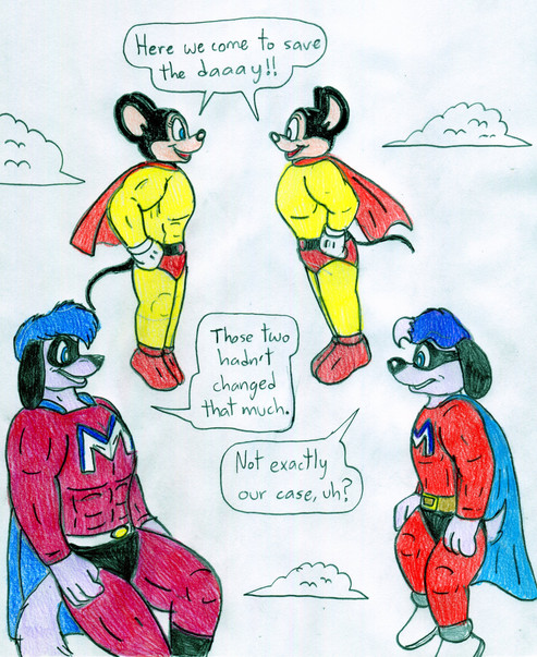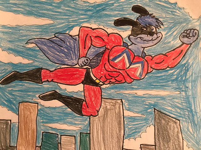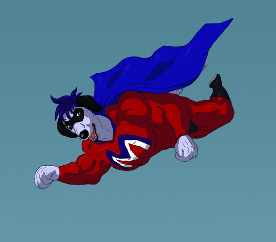 "Here we have Mitchell and Lithius (Major Dog and Mega Mutt) inside Lithius's Lair as they decide to get their costumes repaired after a long hard battle against an evil foe. So the two placed their suits inside a regeneration machine that would repair their costumes and would be out in a few hours, however the machine had a slight hiccup rather than repairing the costumes, their costumes got a slight modification to them rather than being fixed properly. After the machine was finished Both Lithius and Mitchell took the costumes out and as they placed them on there was some differences. Mega's emblem got changed and Major gained a emblem, the capes got changed too as they drape over the shoulders more. Their eye masks got a slight update too but overall their colour schemes are still the same."Originally, this was an iscribble picture that Henry drew and i coloured as I looked to do something with it and i fixed it up.