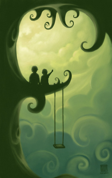 This one's terrific! Are the clouds supposed to form images? I almost see a baby or toddler's head and shoulders in the dark areas to the left. I assume they're dreaming what they're reading?