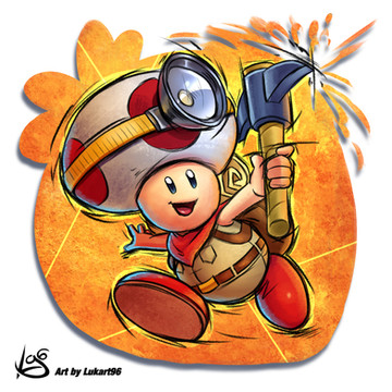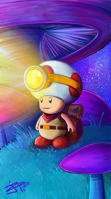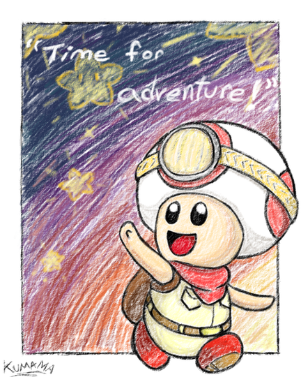Drawing for prompt "toad", I don't think I've ever drawn the Toad from Mario so a friend suggested Captain Toad and I decided to go along with it. Came out a bit Kirby-fied but I liked painting the background.