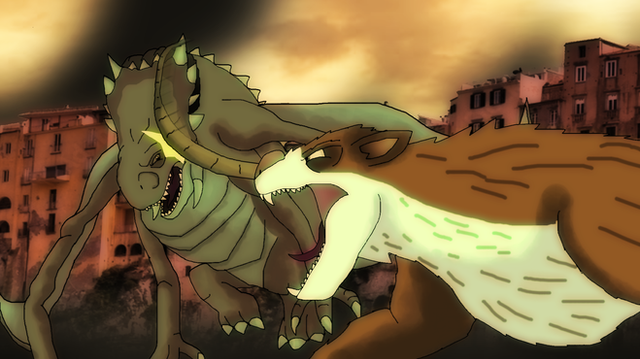 This how a Arthrplueura kaiju would look like. This picture is for TyrantisTerror, I call the creature, Arthropoda Rex, or Bug Rex. A mutaded Arthropleura, the largest arthropod ever, and Triturpis the Dimetrodon here was originaly meant for size comparison, but a fight scene would be better, hence the title, AVD, Arthropleura vs. Dimetrodon, and this picture made me feel weird inside, I felt as if I was making something like Walking with Kaiju, a super sized version of BBC's Walking with.... series, now the thought of a vegetarian arthropod wreaking havoc would sound weird, but this oversized centipede is highly capable of fighting, and since Arthropleura has an extremely tough bite, if it were ever to mutate, that could make a devastating bite.The Dimetrodon is (c) of TyrantisTerror