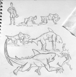 Part 2 of today's schooldump! Focusing on designing the appropriate look for Baya and Sura. Eventually, all the shark-men became their own characters, instead becoming extras. However, each one factored a contributed a part to the design of the final shark monster, a woman simply known as "Queen Sura". I made the main antagonist female in reference to how female sharks tend to be bigger than the males, and a female Great White has an almost two-to-one size advantage against a male saltwater crocodile (of which Baya is based on).In SAE, it was actually a surprise that I designed the monster look before the humans, my reasoning was that since Sura and Buaya were animals, I should start with that first, I dunno, it's just me.
